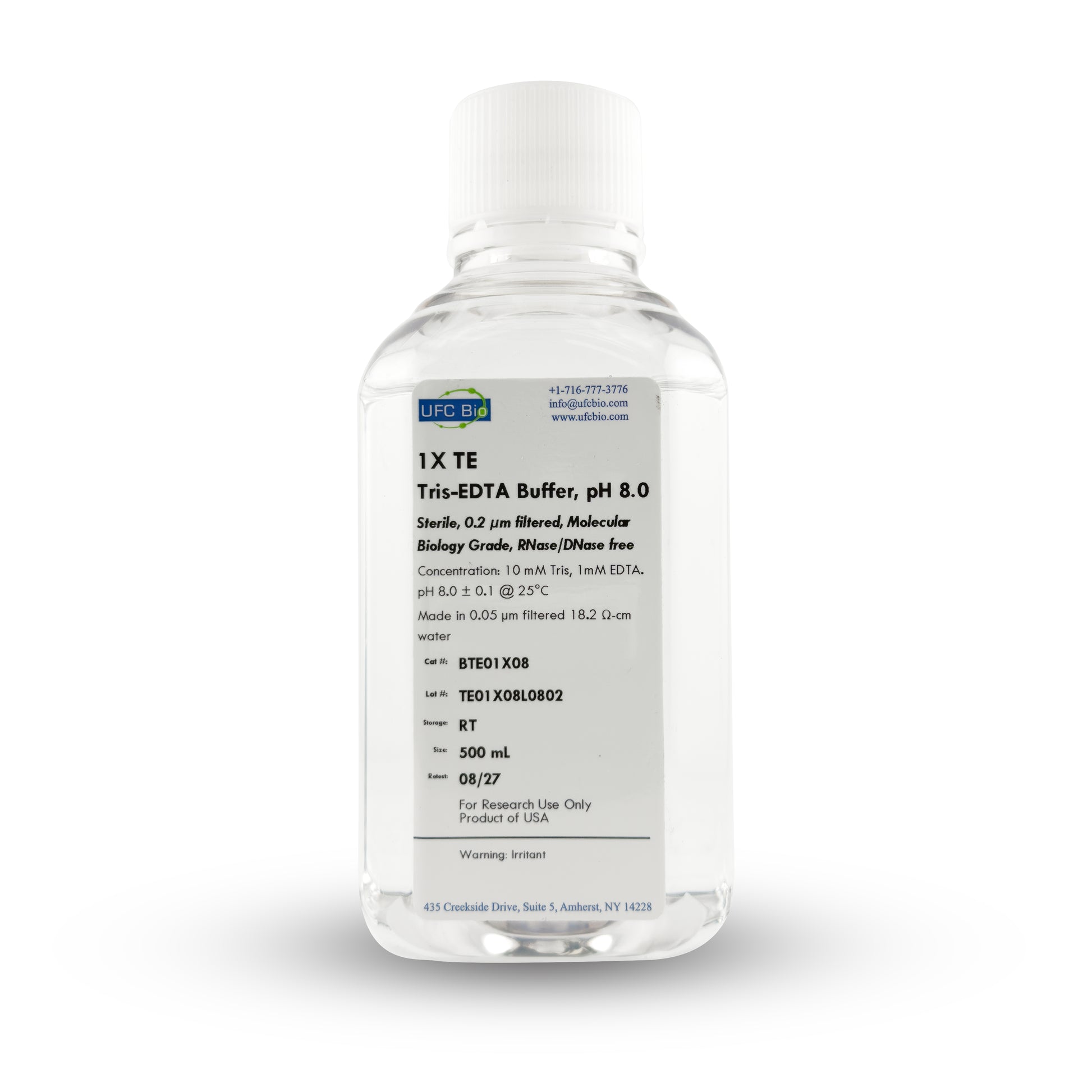 UFC BIO offers 1X TE (Tris-EDTA) Buffer in two pH variants, providing a buffering system within a pH range of 7.6–8.0. Formulated with Tris for pH stabilization and EDTA to chelate divalent cations, the buffer is optimized at pH 8.0 to protect DNA and RNA from degradation. Sterile-filtered at 0.2 µm and DNase/RNase-free, it ensures maximum purity for PCR, sequencing, and nucleic acid purification.