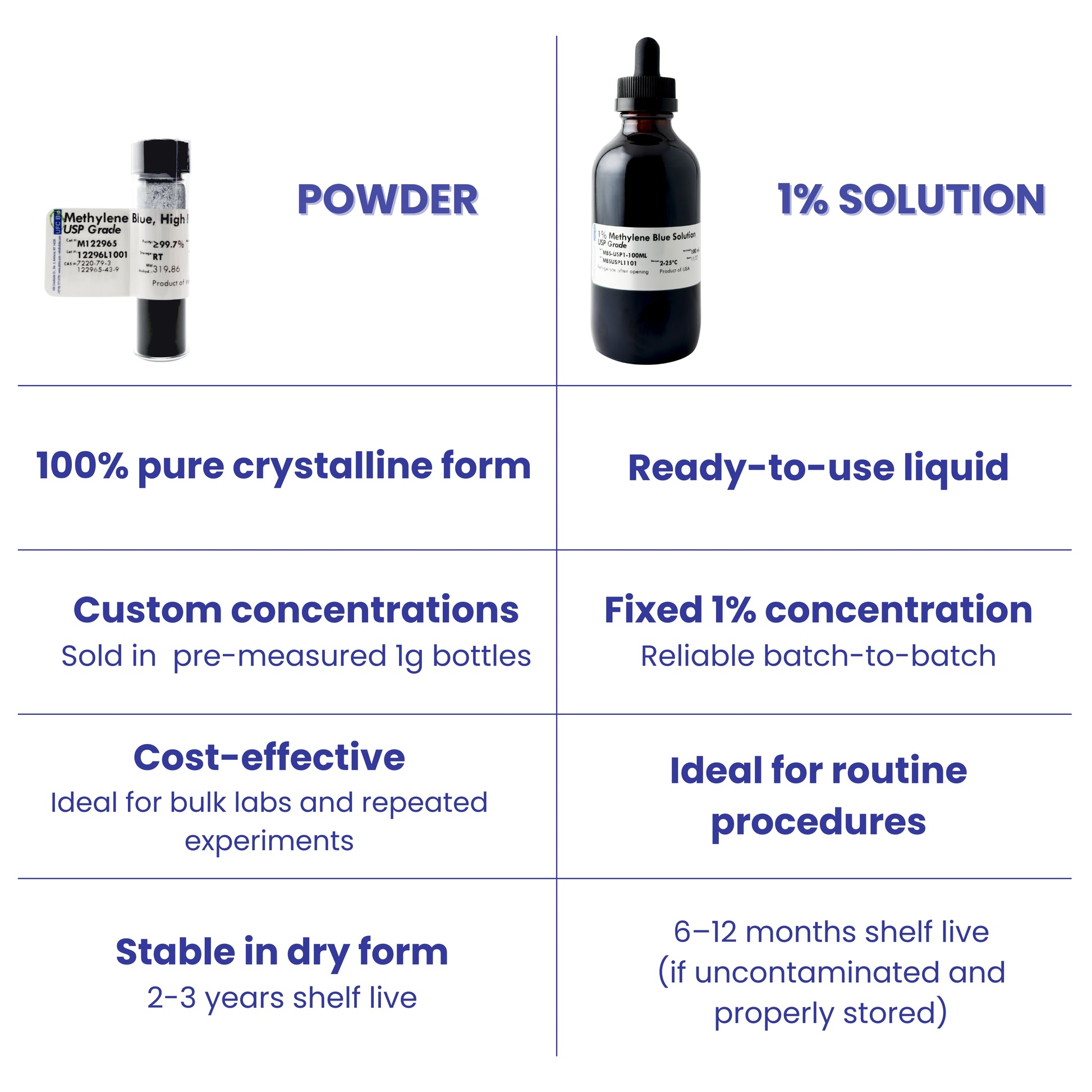 UFC BIO provides high-quality Methylene Blue 1% Solution. It is made with 99.7+% USP grade Methylene Blue and mixed with 18.2 mega ohm-cm water. It is then sterile filtered to ensure premium quality and made in the USA.